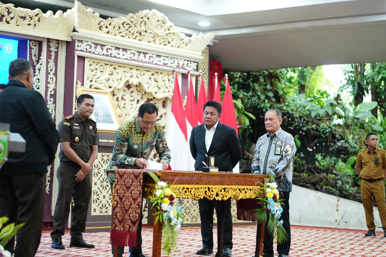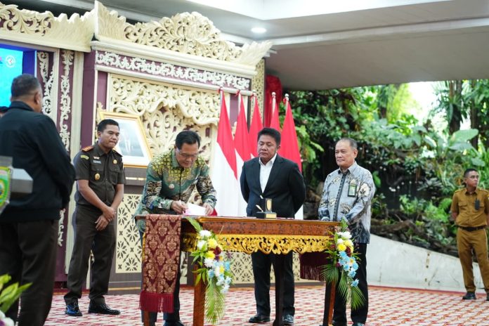 Palembang – Gubernur Sumatera Selatan H. Herman Deru menandatangani Nota Kesepahaman antara Pemerintah Provinsi Sumatera Selatan dengan Kejaksaan Tinggi Sumatera Selatan serta Bupati/Walikota se-Sumsel bersama Kejaksaan Negeri se-Sumsel mengenai Sinergitas Pelaksanaan Pidana Kerja Sosial bagi Pelaku Pidana. Kegiatan berlangsung di Griya Agung, Kamis (4/12/2025).